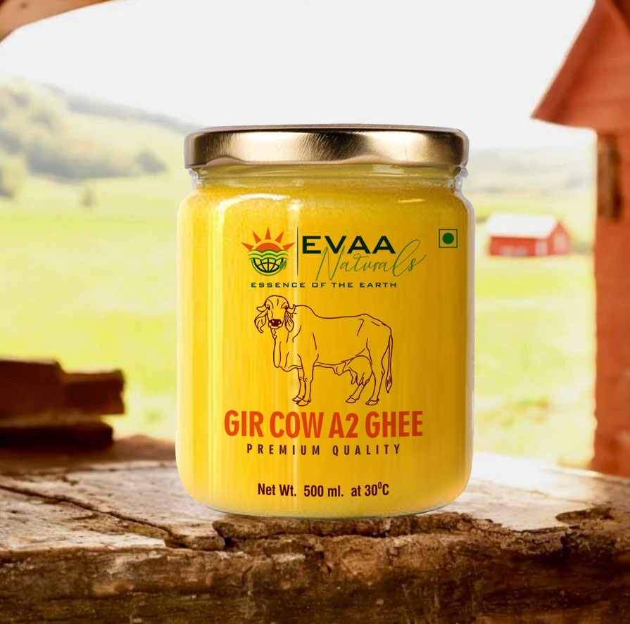 A2 Cow Ghee is made from the nutrition-rich A2 milk of Gir Cows. EVAA NATURALS A2 Desi Cow Ghee is the purest form of ghee made entirely from the milk extracted from Gir Cows. It is prepared by following the traditional bilona or churning method, the process which gives it natural aromatic flavour & texture.